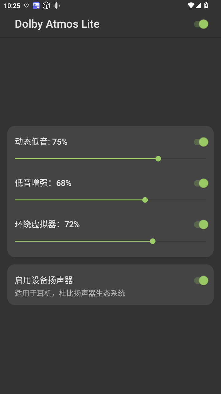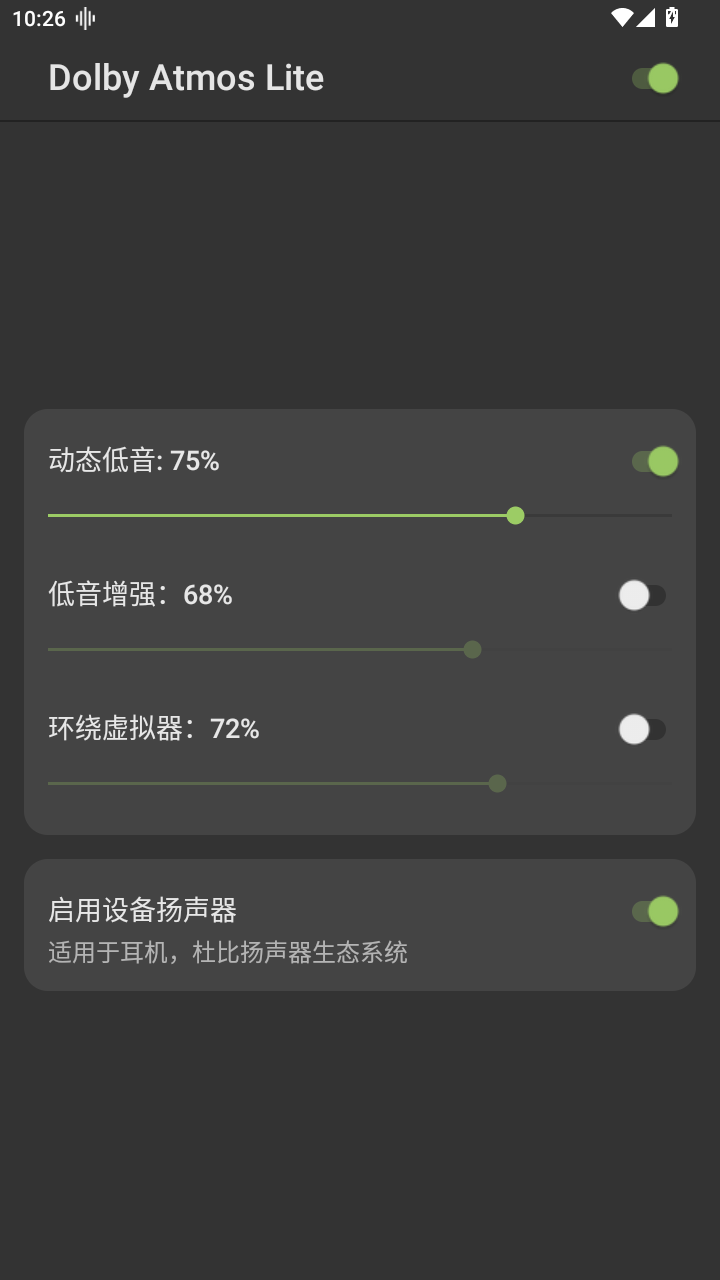 个性化调节:除了基本的音质优化外,Dolby Atmos Lite还允许用户根据自己的喜好进行低音和虚拟环绕音的调节。这种个性化的设置使得用户能够根据自己的听音偏好,打造出最适合自己的音质效果。