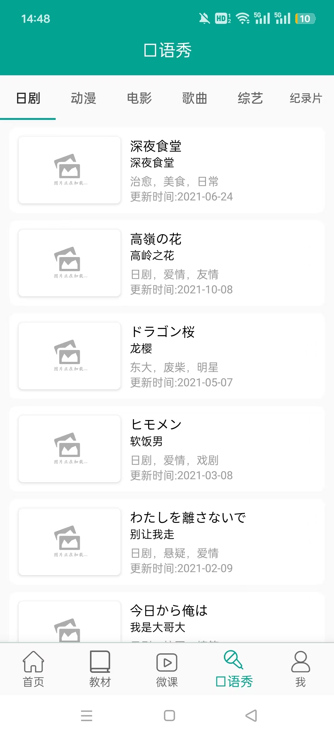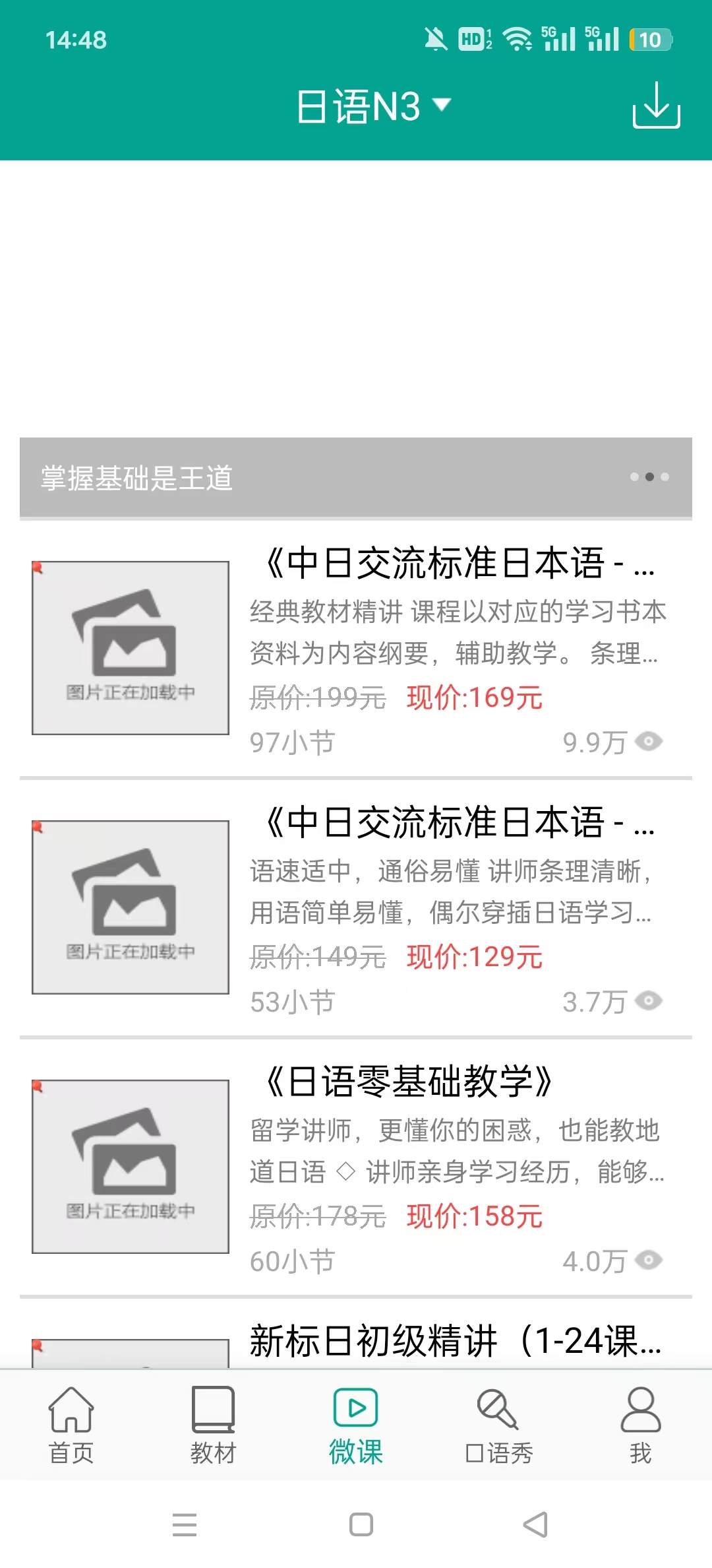1、打开大家的日语app,进入应用首页,主要学习功能部分有日语微课、视频和口语秀的栏目等。
