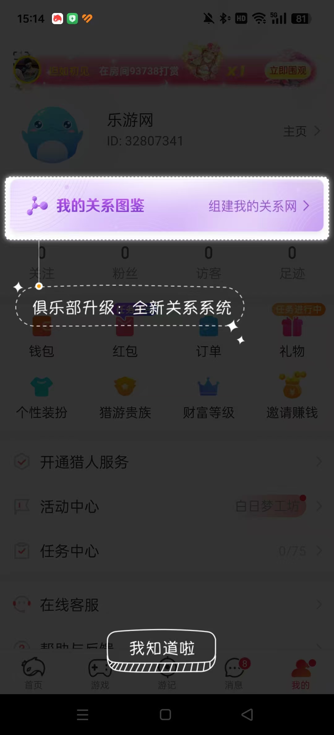 1、在注册完猎游app下载陪玩平台以后,来到的【我的】界面。