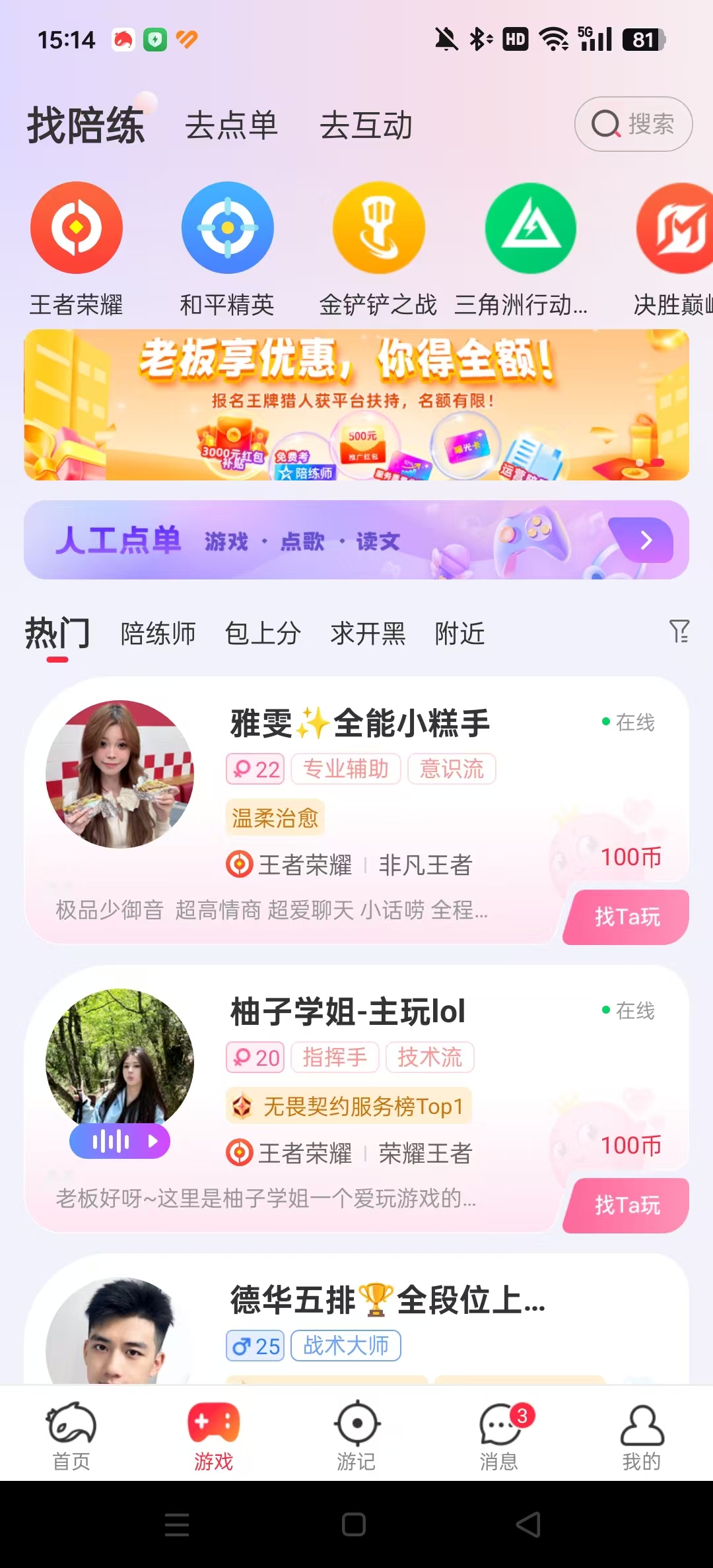 【陪练开黑】找大神王者开黑、找萌妹组队吃鸡,24小时随时随地找到心仪猎人,畅享翻倍游戏乐趣!
