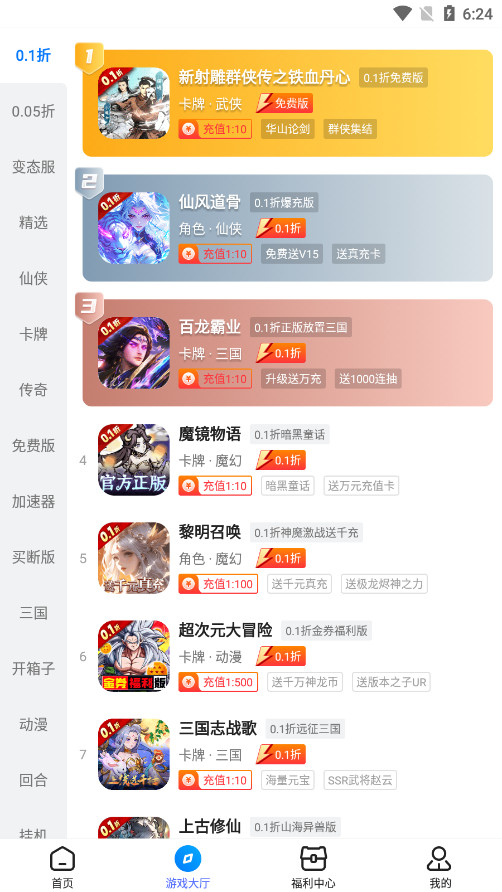 涵盖大量BT服、公益服、GM版手游,上线即送VIP,无限元宝等。