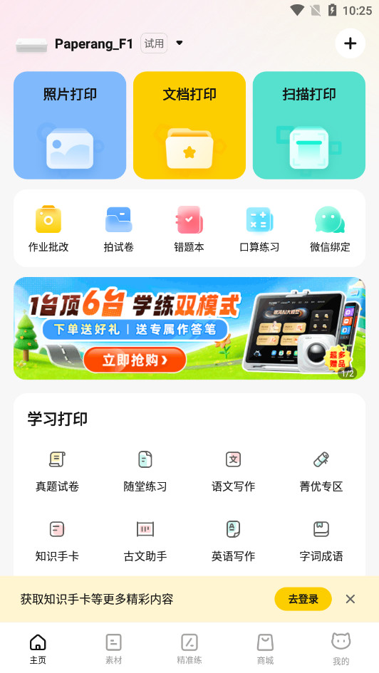 一切准备就绪,开启打印之旅。可以在APP中选择要打印的内容,也可以对习题进行拍照打印。