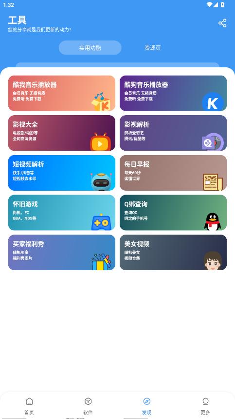 发现界面为用户提供了音乐播放,影视大全,短视频解析,怀旧游戏等实用功能