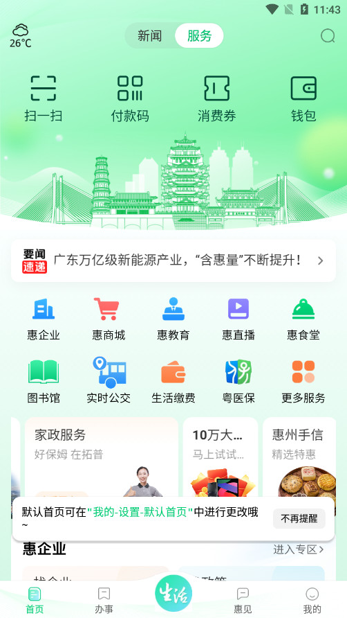 整合本地各类生活服务资讯,为用户提供衣食住行、吃喝玩乐攻略指南,以及教育、婚恋、家政、文旅、美食等综合性、一站式服务,打造惠州人网上生活家园,让用户直观感受惠州城市温度与活力。