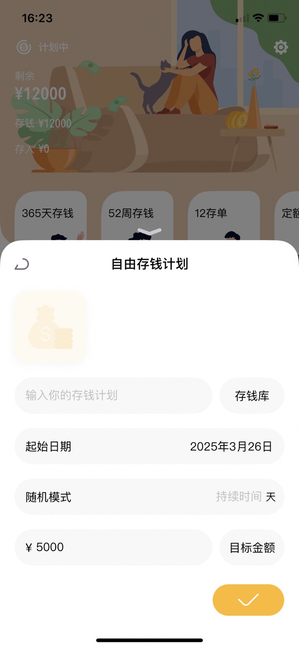 填写存钱计划,起始日期,模式,目标金额,点击确定