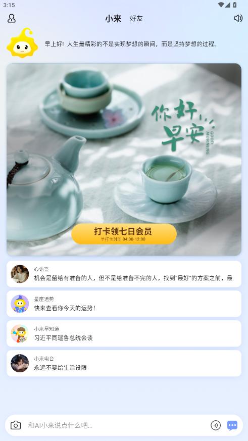 提供每天专属定制语音问候、天气贴心提示、好友陪伴打卡等关怀服务,智能陪伴你的三餐四季。