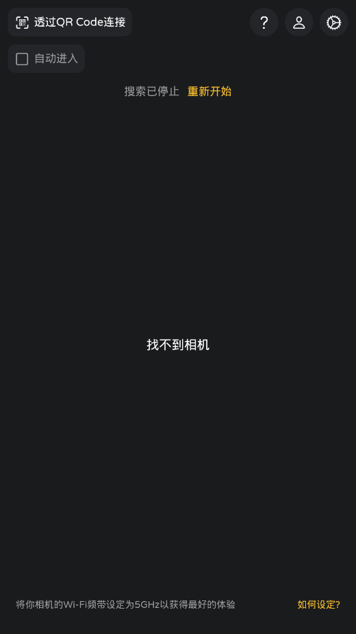 扫描相机屏幕上显示的QR码,之后应用程序会尝试搜索你的相机,这个过程在第一次会花上数秒时间现在你的相机资讯将会出现在画面上,如果没有,点击重新开始以重启搜索