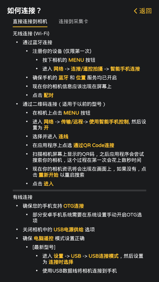 进入 网络 -连接/遥控拍摄 -智能手机连接确保手机的 蓝牙 和 位置 服务均已开启现在你的相机信息应该出现在屏幕上点击 配对通过二维码连接(适用于以前的型号)