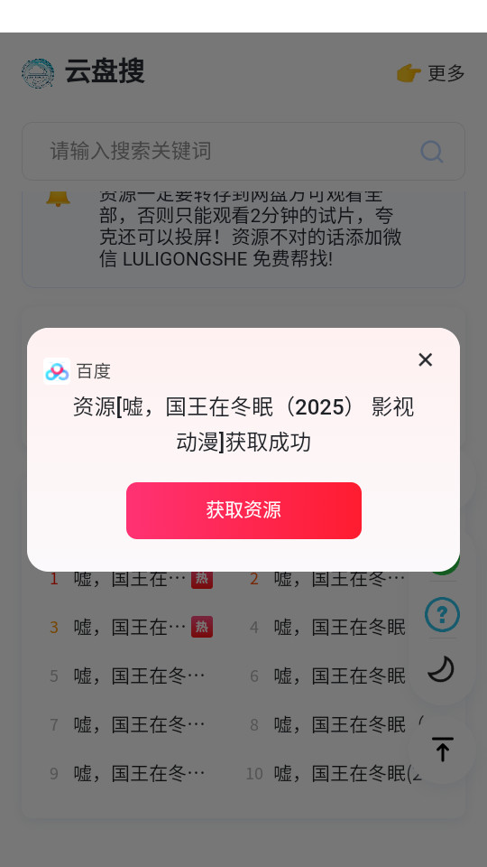 3、整合多个网盘平台资源,无论是热门影视、学习资料还是软件工具,输入关键词即可快速获取,满足多样需求。