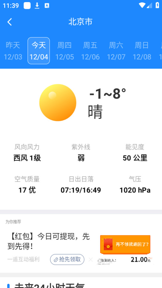 4)24小时预报功能,除了实时展示目前的天气情况外,还能够提前预报未来24小时的天气情况,更方便用户合理安排活动。