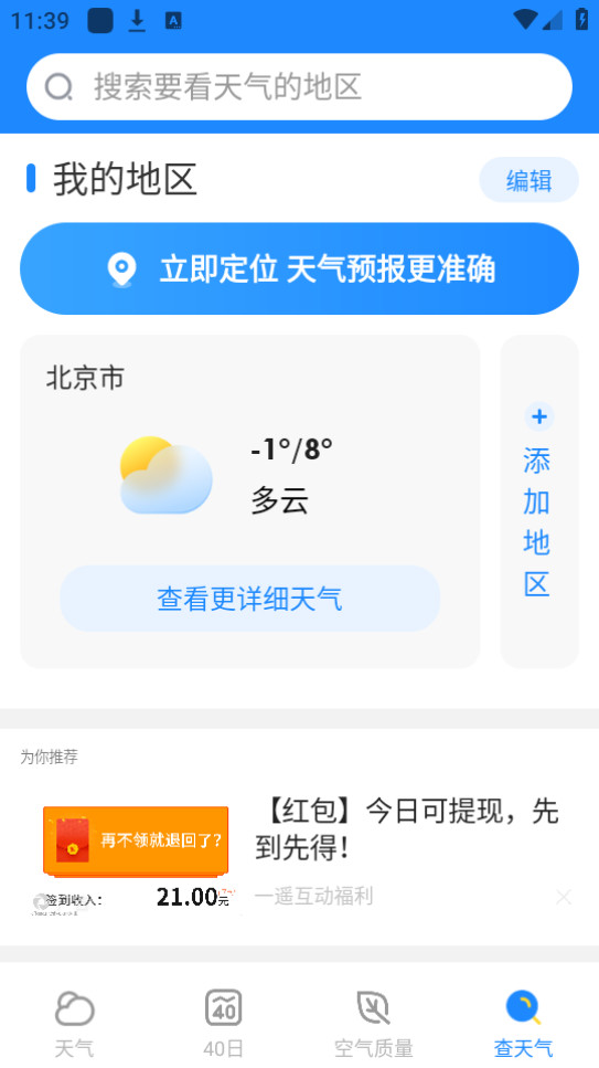 专业、贴心、及时的天气APP,为您提供准确和全面的天气服务。24小时天气预报、未来15天天气预报、空气质量指数、温度趋势、pm2.5等全国各地实时天气信息供你随时查看。同时还有穿衣、紫外线、舒适度等生活指数为你的健康生活保驾护航。
