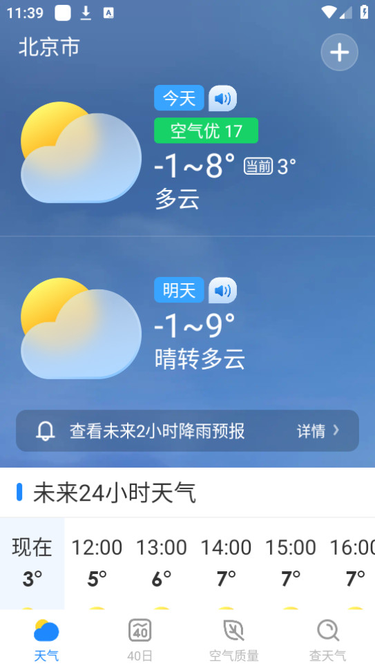 【24小时预报】以小时级呈现国内城市天气,提前掌握晴雨趋势。