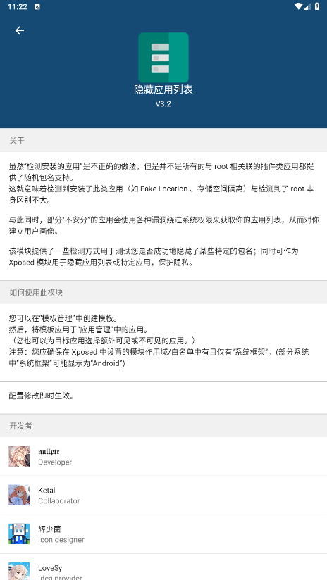 工作模式(黑白名单):黑名单就是,你在额外不可见应用这个列表里面勾选的,他就隐藏。反之白名单的话,你勾选的才能检测到。然后不建议使用白名单,因为有的app会调用浏览器之类的系统应用,如果你使用了白名单又没有设置浏览器等系统应用的话,就会造成app异常。