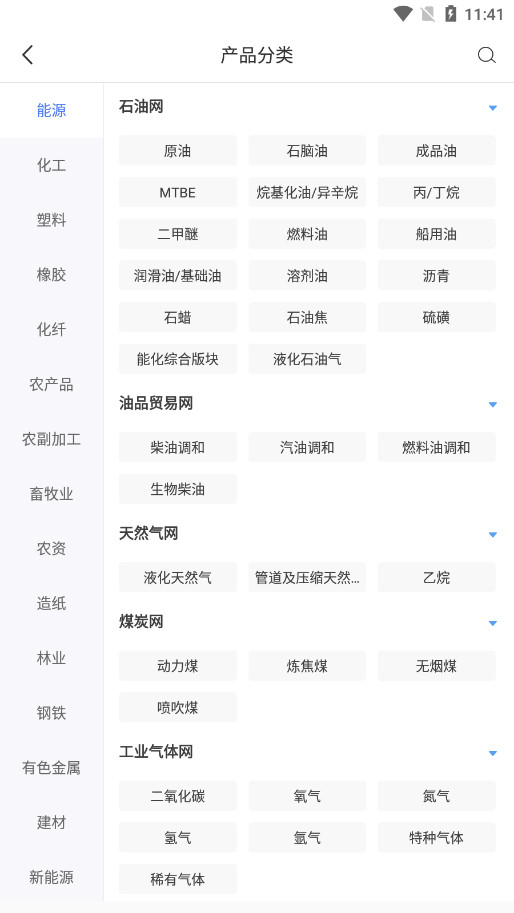 产品覆盖能源、有机化工、无机化工、塑料、橡胶、氯碱、煤化工、纺织原料、聚氨酯、涂料、工业气体、非金建材、钢铁、有色金属、油脂化工、农资、初级农产品、农产品加工、畜牧业、林业、造纸、新能源、新材料、再生资源等大宗商品行业。