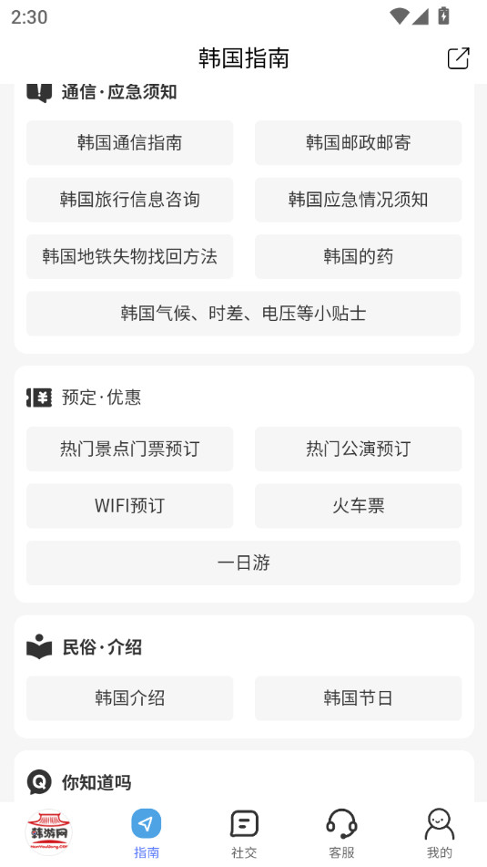 1,旅游资讯:提供丰富的韩国旅游信息,有包括护照,签证等旅游材料准备的信息;也有韩国旅游攻略,景点,餐饮,美食,购物,退税,中文地铁图等旅游中大家所必须了解的资讯信息,十分全面;