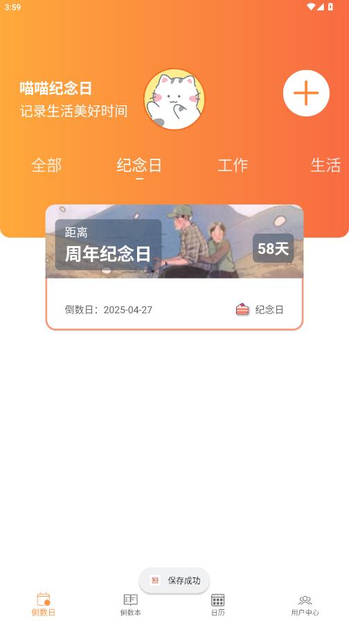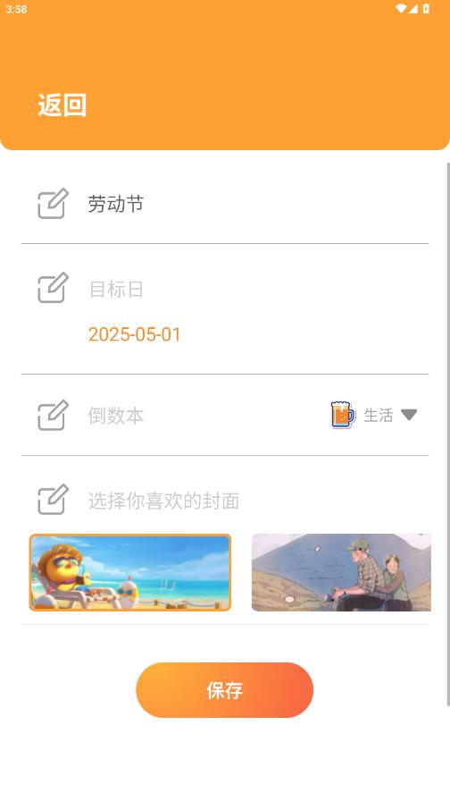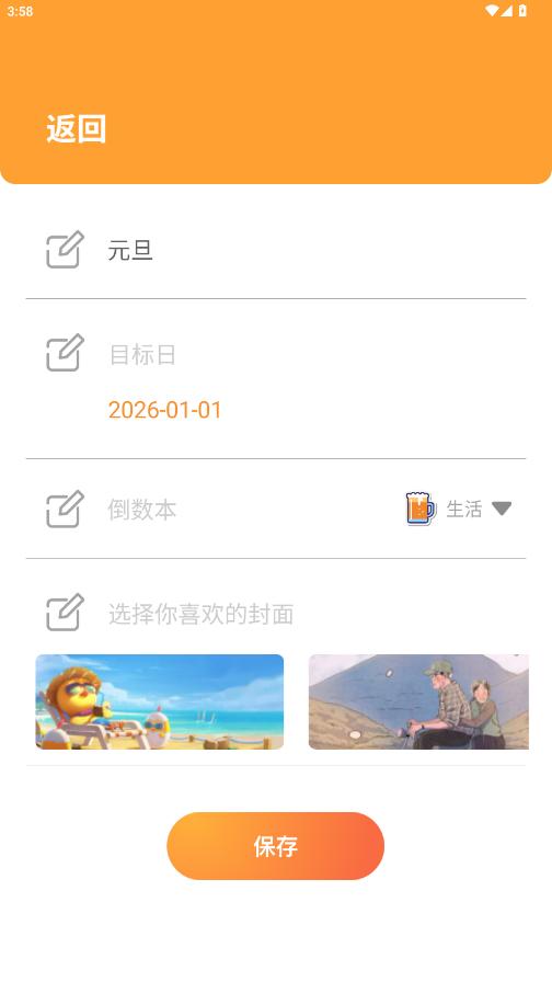 输入纪念日标题,目标日,选择倒数本,封面,点击保存