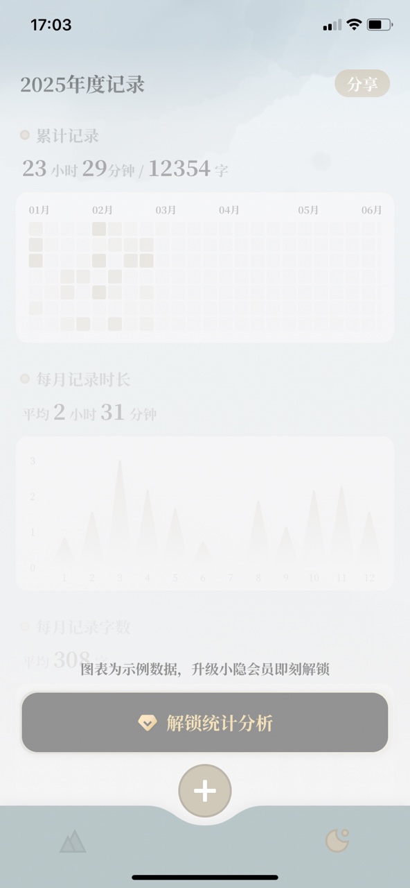 「效率统计」小隐会追踪每篇创作的记录时长、字数汇总、记录偏好等动向,并将它们汇总成直观清晰的图表,掌握创作效率,不负美好时光