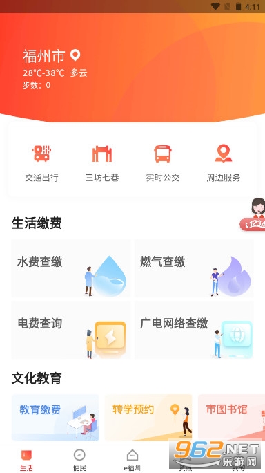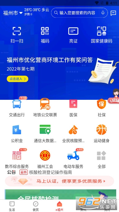 《e福州》是福州市政府为方便人民日常办事的一款掌上生活服务平台软件,软件为各位市民提供有水电费缴纳、旅游交通出行、线上政务服务、医疗健康社保缴纳以及其他许多生活方面的服务,有需求的朋友们快来下载吧!