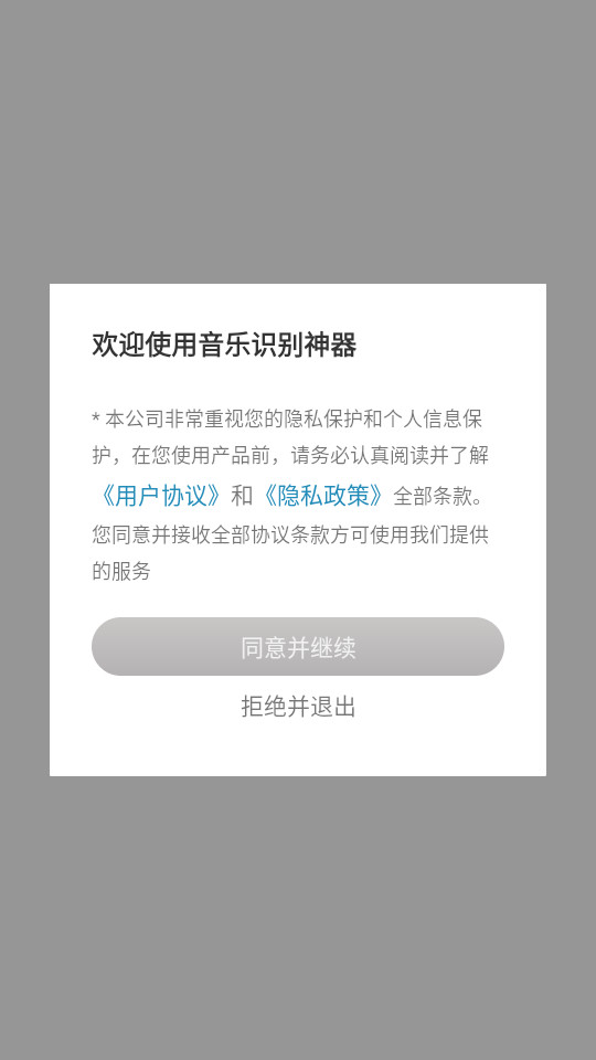 下载安装并打开音乐识别神器app,点击同意并继续
