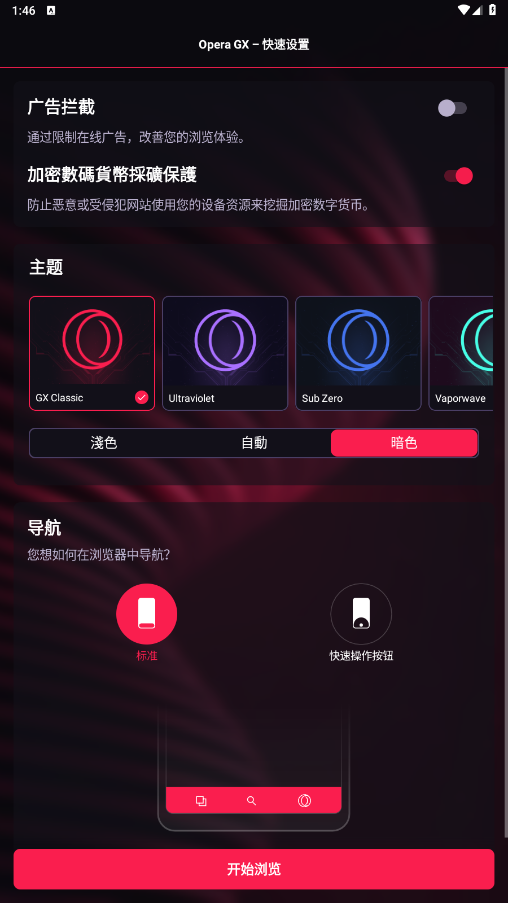 广告拦截:Opera GX内置了高效的广告拦截器,能够自动屏蔽网页上的广告,提高网页加载速度,保护用户隐私。