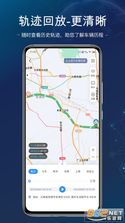 为了方便用户在轨迹回放时更全面看到车辆位置信息,新版立即定位APP在轨迹回放时新增轨迹缩略图,播放轨迹时,既能看到放大的车辆追踪细节,也能宏观看到车辆在整段轨迹中的进程。