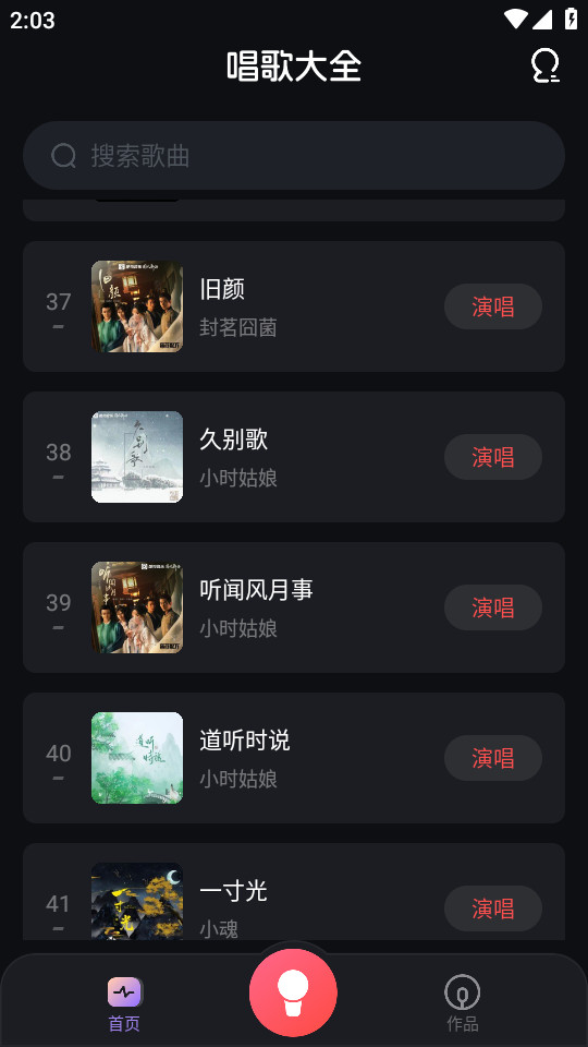 2、进入首页之后,汇集了海量的歌曲资源,选择想要唱的歌曲点击右侧的“演唱”。