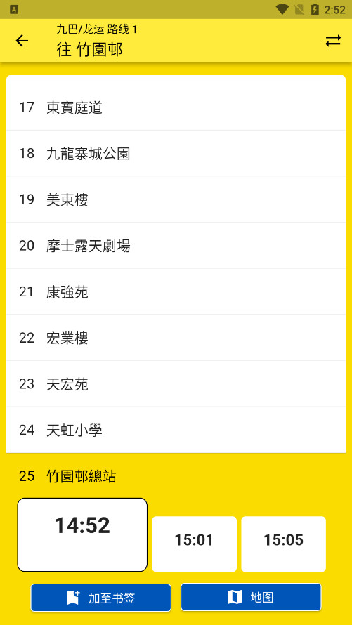 3、之后它会给出具体的巴士发车时间,这里如果是其他事情要忙,可以先【加至标签】,查看具体行程地图,之后再去完成出行也是可以的。