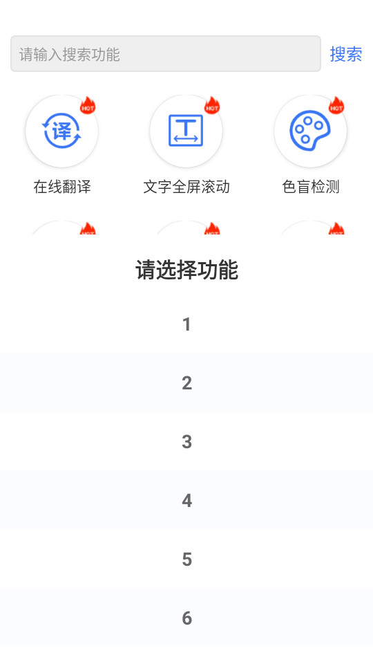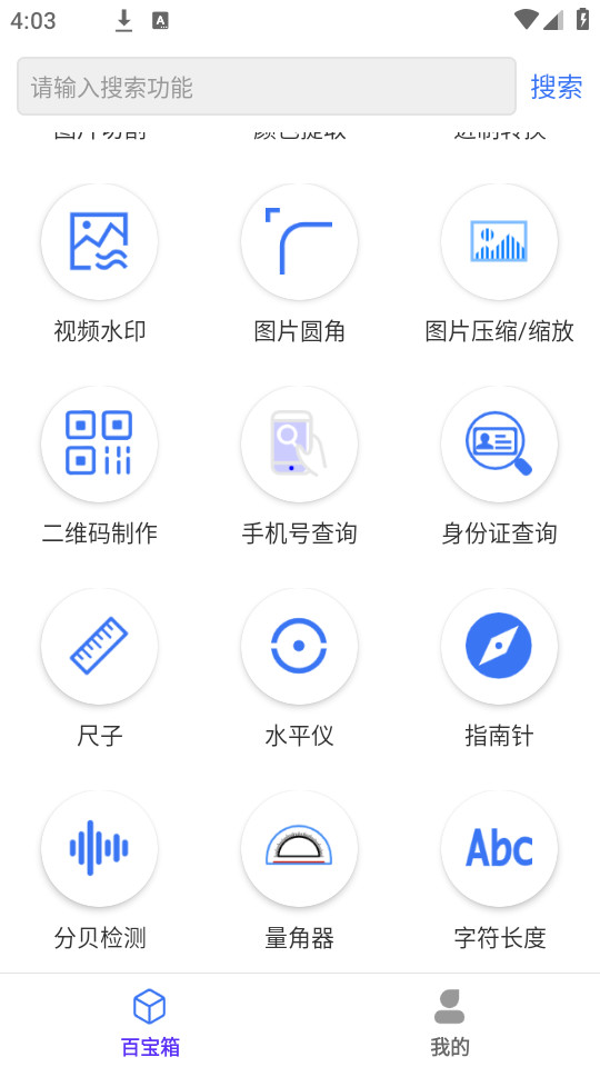 在线翻译(支持各个国家语言互相翻译),文字全屏滚动(类似跑马灯效果,支持自定义颜色和背景), pdf转word ,(各种文档之间相互转换)局域网传输文件(局域网内实现文件互传,可实现机顶盒与手机app传输文件), 汇率计算(在线实时各国之间汇率计算), 屏幕坏点检测(检测手机屏幕色彩和屏幕坏点), 提取apk(提取安装包,应用信息,并保持到本地文件), 纯色图片制作(制作各种颜色的纯色图片), 色盲检测(色盲图片检测), 图片切割(将一张图自定义切割成任意张), 颜色提取(给定任意一张图片,可以提取图片上任意一点的像素颜色值), 进制转换(各种计算机进制互相换算), 视频水印(给视频添加水印), 图片圆角(图片设置自定义圆角,可自定义单独设置每个角的圆角), 图片压缩(将图片按照缩放进行压缩或者质量进行压缩),二维码制作(制作二维码图片,支持自定义背景色和前景图), 手机号查询(查询手机号归属地), 身份证查询(查询身份证信息), 尺子(自定义刻度尺子),水平仪(测量水平角度),指南针,分贝检测(检测周围环境噪音,分贝),量角器(利用相机和传感器测量现实物体的角度),字符长度(计算任意一串字符串的长度),计数器(比赛计数),掷骰子(自定义骰子个数),大转盘,灯光闪烁(模拟闪光灯),手绘图片,纯音测试,金属探测器,扬声器除尘,扬声器排水,亲戚称呼计算,低多边形图片,域名转ip地址,图片高斯模糊,图片转素描,数字时钟,文本工具集合(英文字母大小写转换,文本去重分隔,文本替换,文本反转排序,文本增加序号,特殊符号大全,花体英文转换器,字数统计,内容重复率检测,中英文排版纠正器),语言工具集合(简体繁体转换,汉语拼音转换,粤语拼音转换,成语查询,五笔编码,拼音首字母缩写,姓名拼音转换器),财务工具(人民币大写转换器,支票日期大写转换器,英文金额大写转换器,税金税率计算器,个人所得税计算器,个人劳务报酬所得税,世界各国地区货币,列表求和计算器,合同款项计算器),日期工具集合等
