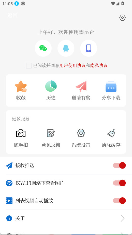 下载安装并打开望昆仑app,点击同意