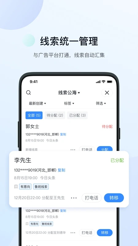 产品特点:连接广告与客户,优化投放效果,同时结合客户再营销,提高您的广告投放效果。一站式管理线索,提高处理效率,广告投放搜集到的表单、电话、咨询类销售线索全部汇总,进行一站式管理,可以便捷的进行线索分发,同时设置了严格的权限管理,保护用户的数据安全。