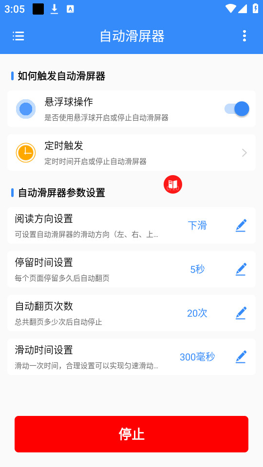 3、开启权限之后回到首页页面,设置定时触发,主要是凯奇或者停止自动滑屏器的时间,也可以开启悬浮球权限。