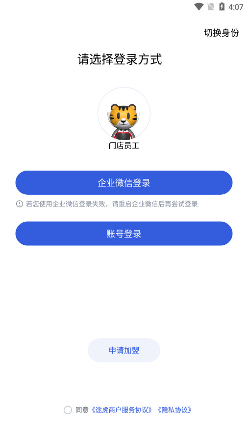 2、如果是途虎养车员工,则可以通过切换身份的方式,来到员工专属登录界面。
