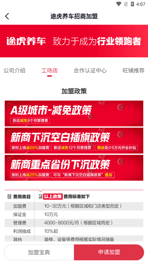 3、若是想成为加盟商,入驻途虎养成,自己当老板开店赚钱的话,就请选择【申请加盟】。