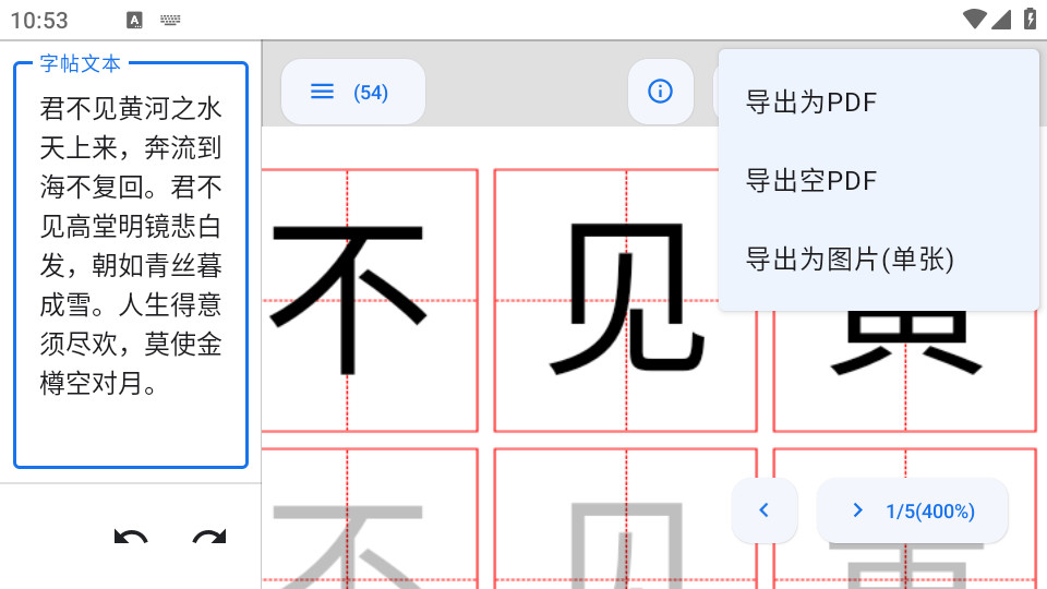 《字帖制作app》是一种专门用于生成个性化字帖的应用软件,具备多种字体选择、自定义字帖内容、实时预览、打印和下载等功能。支持生成汉字字帖、拼音字帖、数字字帖、国风字帖以及空白字帖等多种类型。用户可以根据自己的喜好或书写需求,调整字体、字号、格式和颜色等设置。内置了包括唐诗、宋词等经典文学作品的字帖模板。支持打印和下载功能,方便用户保存和使用字帖。