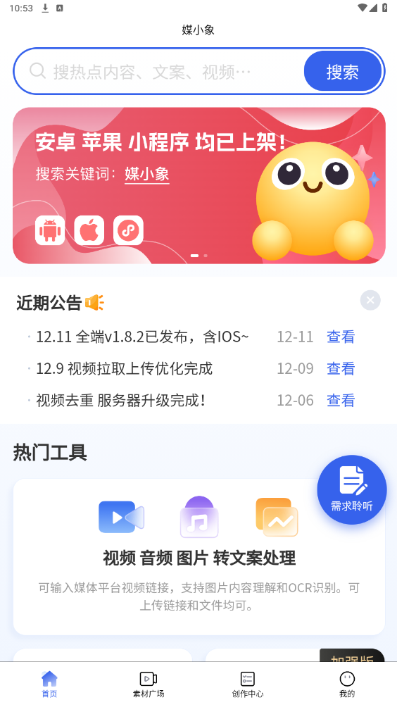 媒小象是短视频创作者的一站式工具箱。里面提供了多种功能供用户去选择,而且操作起来非常的方便,能够满足大多数用户的使用需求,同时还设有素材广场供用户去查看,帮助你轻松打造爆款视频,感兴趣的朋友们快点来下载试试吧!