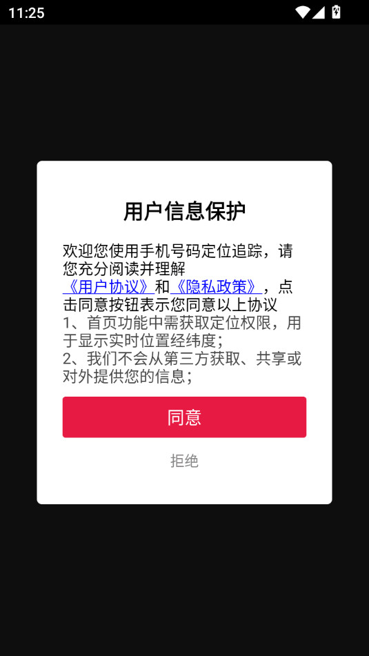 下载安装并打开手机号定位追踪app,点击同意