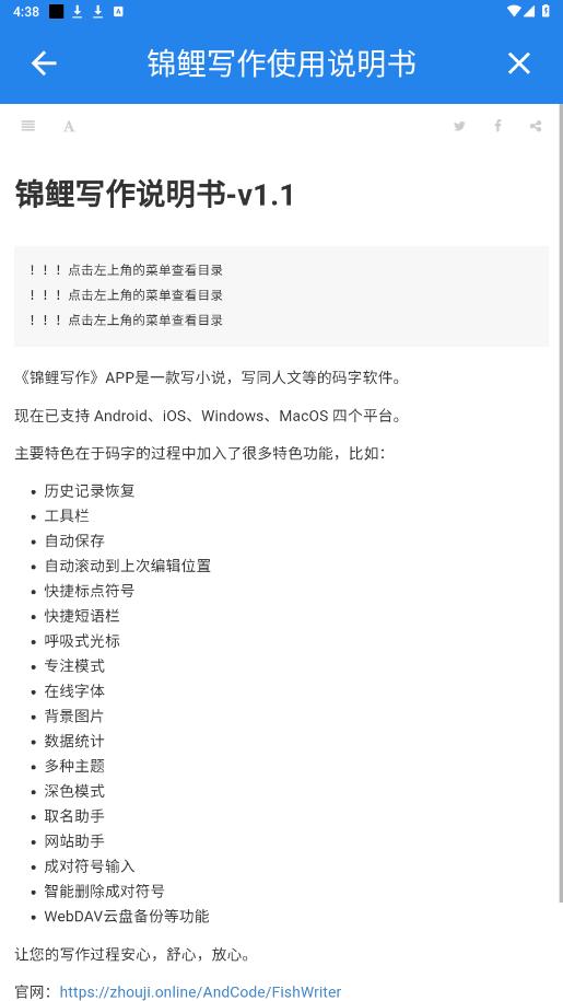 天津周记软件科技有限公司。欢迎使用《锦鲤写作》App,本软件用于写小说、同人文等,提供各种主题设置、写作辅助编辑功能,让您写作丝般顺滑,如鱼得水,如果您觉得好用,不妨动动您发财的小手指,推荐给好友,一起快乐码字吧~