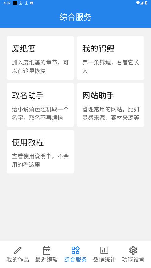 《锦鲤写作》专为热爱创作的小说家和同人文写手打造的高效码字工具。它不仅界面简洁、操作便捷,还拥有丰富的创作辅助功能,如灵感提示、情节大纲、角色设定等,助你轻松构建精彩纷呈的故事世界。无论你是初学者还是资深写手,锦鲤写作都能成为你灵感迸发的得力助手,让你的文字之旅更加流畅愉快。快来下载锦鲤写作APP,开启你的创作之旅吧!