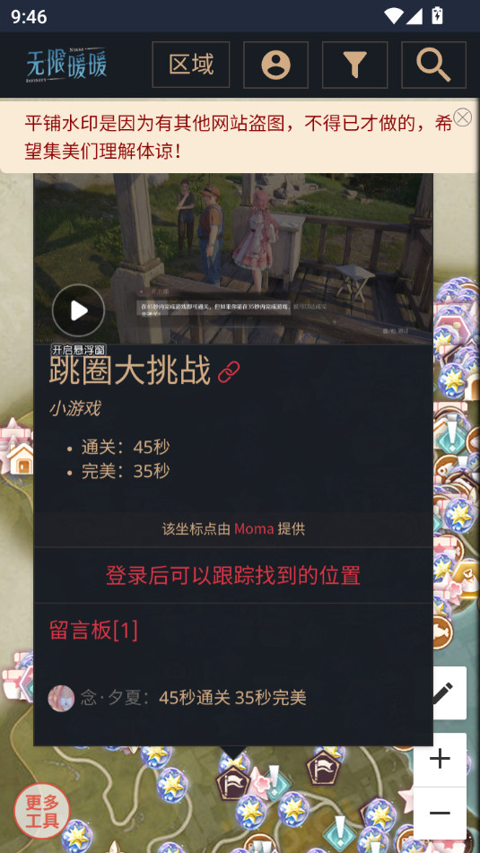 《无限暖暖互动地图工具app》是一款为《无限暖暖》游戏玩家设计的辅助工具,旨在帮助玩家更好地探索游戏世界、追踪任务和收集物品。玩家可以右键点击地图的空白区域,创建新的坐标点,并输入标题、描述和截图。地图上设有预设区域,玩家可以记录本区域内收集的完成进度条,方便追踪收集进度。支持关键词搜索功能,玩家可以通过输入时装名称或相关关键词,快速定位到具体的时装宝箱或任务点位。