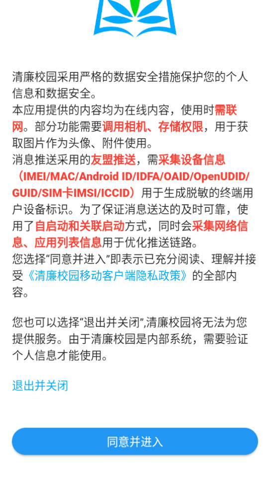 下载安装并打开清廉校园app,往下滑动,点击同意并进入
