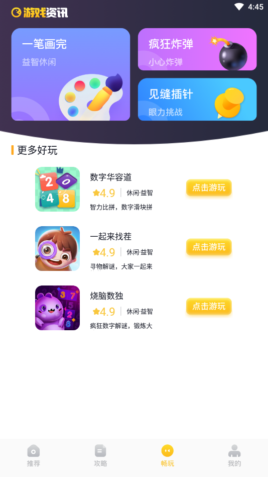 在畅玩界面,大家可以点击数字华容道,一起来找茬,一笔画完,疯狂炸弹,见缝插针等游戏,点开即玩!