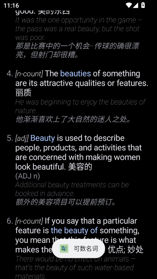能够查看单词的详细释义以及各种例句