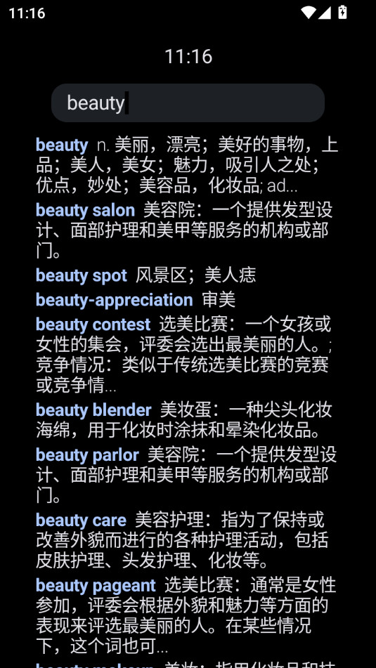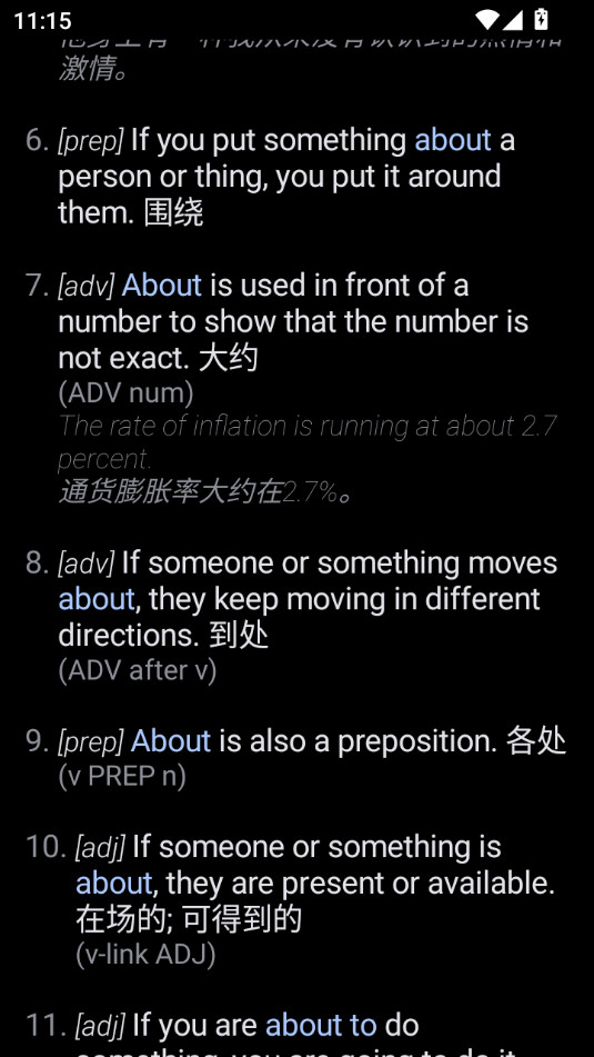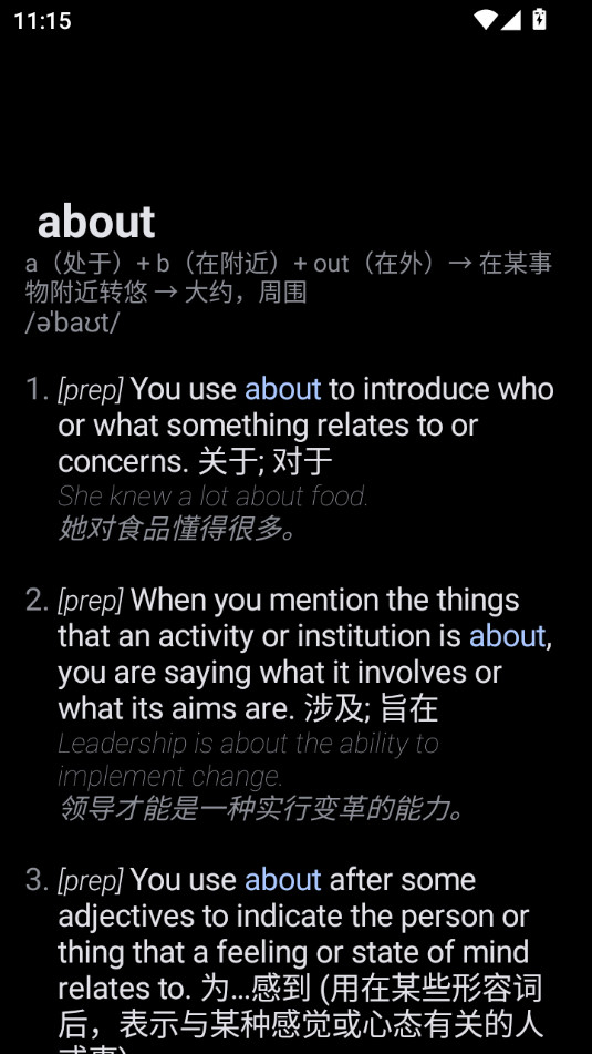 除了基本的中文释义,腕事词典APP还支持部分单词附带英文例句,帮助用户理解单词在实际语境中的应用。