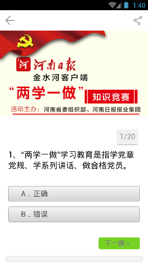 河南日报两学一做金水河客户端是河南日报最权威的知识阅读应用,里面有最新的两学一做答题平台,上面总共有三套答题试卷,参与人员可以在线答题,里面还有非常权威的河南新闻资讯,帮助你更好的了解河南。