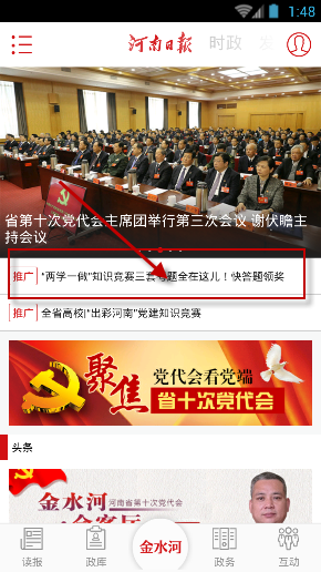 《河南日报两学一做金水河客户端》是一款党员学习手机软件,为河南省特别是国家公职人员打造的,资讯平台,并且最近有两学一做的知识竞赛,大家可以参加哦,下面小编带来河南日报两学一做金水河客户端下载地址。