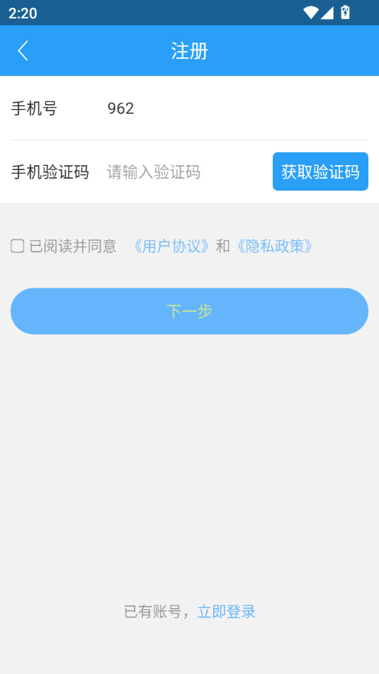 输入手机号验证码,勾选用户协议,点击下一步就可以了