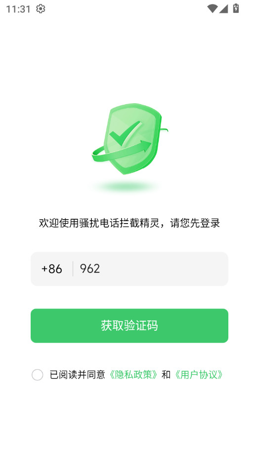 输入手机号,勾选用户协议,登录账号之后开启拦截就可以了