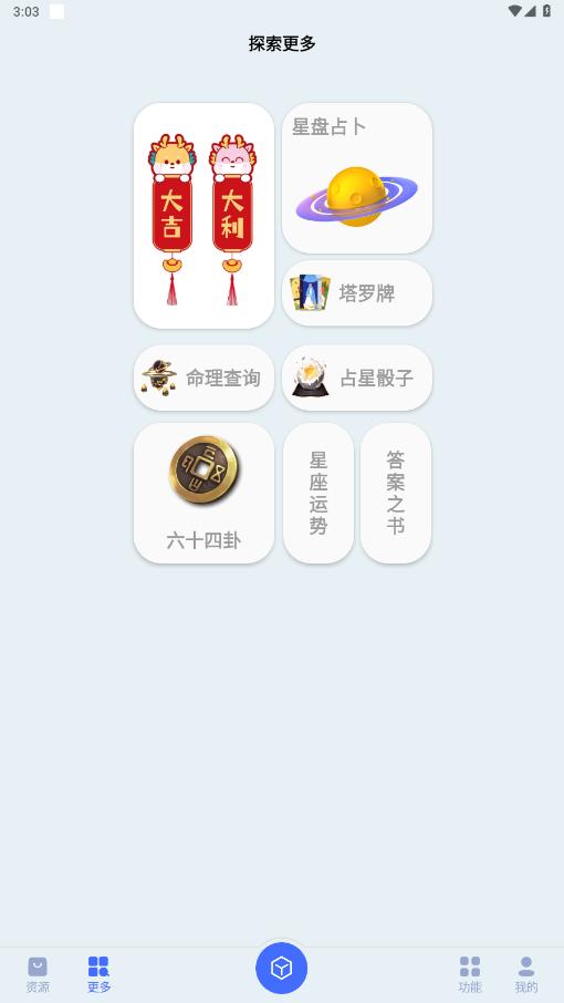 进入更多界面,在这里可以算命理,查看星盘占卜,抽塔罗牌等等