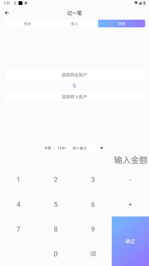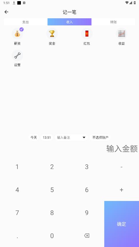 选择记得是收入,支出还是转账-类型,输入金额,点击确定