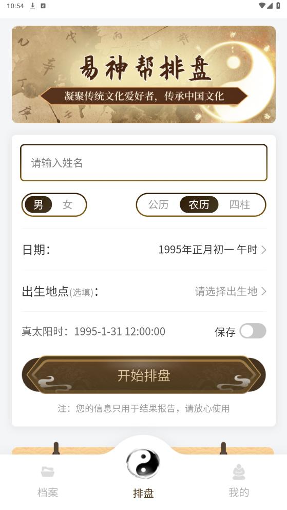 打开软件,同意相关协议,进入排盘界面